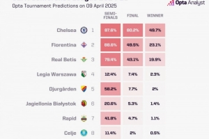 英超赛程-Opta预测欧协联夺冠概率:切尔西49.7%领跑,佛罗伦萨23.1%第二
